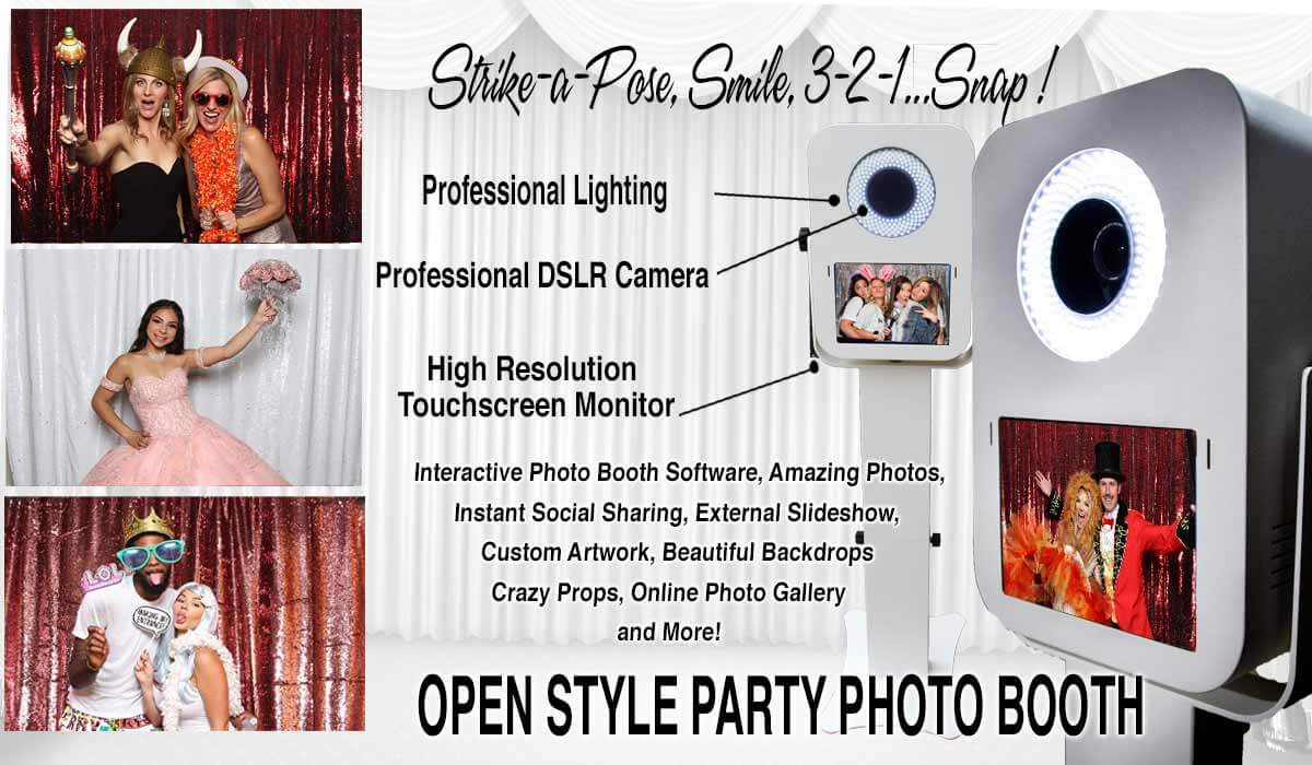Our elegant, beautiful Open-Air Booth is a wedding exclusive!. It is equipped with a professional camera, pro-lighting, and a high-quality printer to make you look great! The open-air concept encourages your guests to get in on the action when seeing others excited about having their pictures taken! You can fit a lot of people in one shot and the picture quality is amazing!